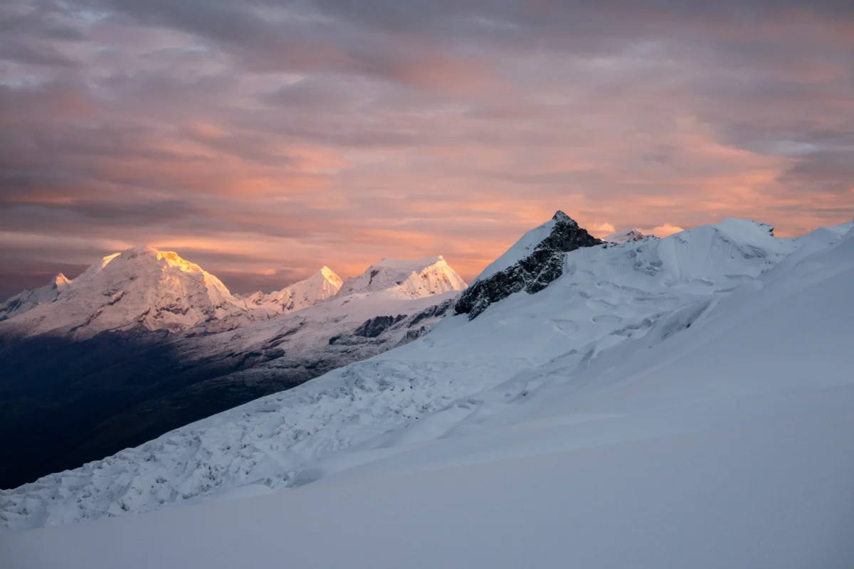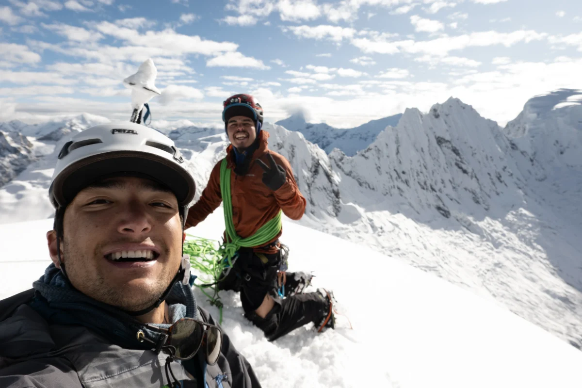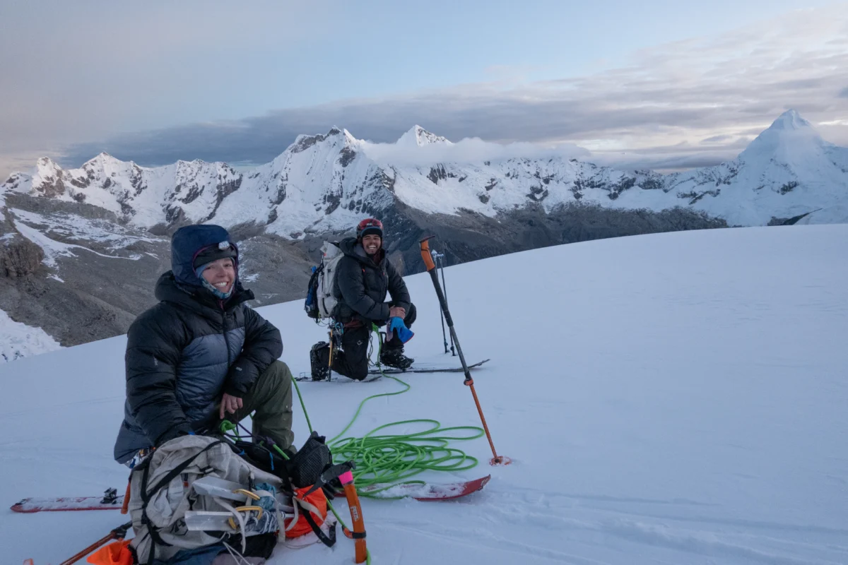Our second attempt, this time with a lighter setup and without skis, marked a change in style. We camped higher on the moraine as snow fell steadily overnight, and as we tried to sleep, we had to bat the tent walls to keep snow from piling up. High on Vallunaraju, as we approached the col between Vallunaraju Norte and Sur, two descending Peruvian climbers wished us well: “Con suerte,” they said, “with luck.” Their words stuck with us. Summiting the next morning under clear skies was a moment of quiet joy.