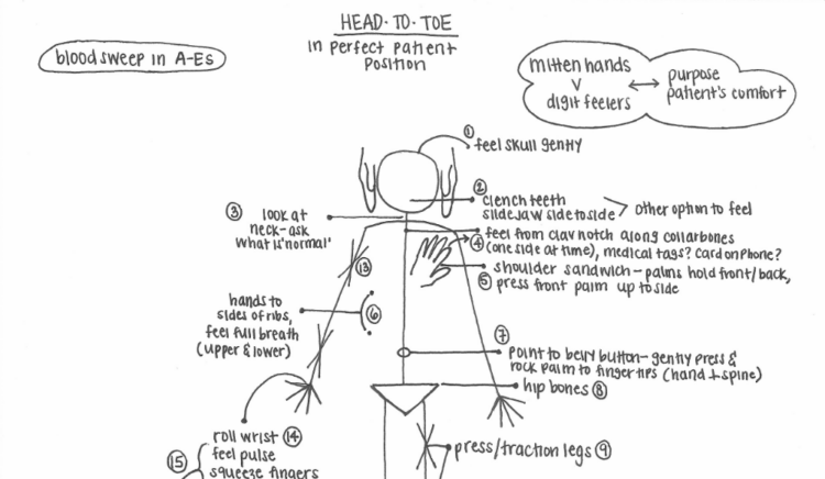 Review the steps of the head-to-toe exam with this NOLS Wilderness First Aid grad's hand-drawn diagram.